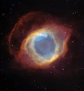 After fusing helium in its core to carbon, the Sun will begin to collapse again, evolving into a compact white dwarf star after ejecting its outer atmosphere as a planetary nebula. The predicted final mass is 54% of the present value, most likely consisting primarily of carbon and oxygen.[1]