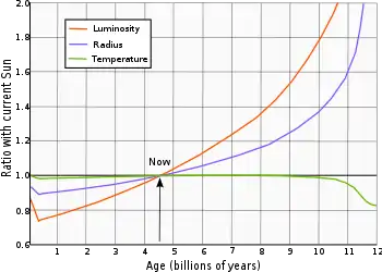 In about one billion years the solar luminosity will be 10% higher, causing the atmosphere to become a "moist greenhouse", resulting in a runaway evaporation of the oceans. As a likely consequence, plate tectonics and the entire carbon cycle will end.[14] Following this event, in about 2–3 billion years, the planet's magnetic dynamo may cease, causing the magnetosphere to decay and leading to an accelerated loss of volatiles from the outer atmosphere. Four billion years from now, the increase in Earth's surface temperature will cause a runaway greenhouse effect, creating conditions more extreme than present-day Venus and heating Earth's surface enough to melt it. By that point, all life on Earth will be extinct.[15][16] Finally, the most probable fate of the planet is absorption by the Sun in about 7.5 billion years, after the star has entered the red giant phase and expanded beyond the planet's current orbit.[17]