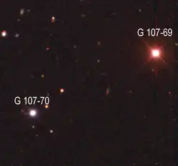 G 107-69/70 is a quadruple system, consisting of the astrometric binary G 107-69 and the resolved binary G 107-70.[2] The system is 36.76 light years (11.27 parsecs) from Earth.[1] G 107-69 and G 107-70 are separated by 103.2 arcseconds, or 1163 astronomical units (AU).[2]