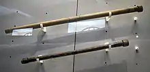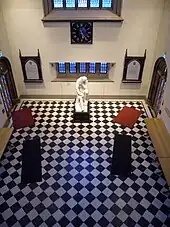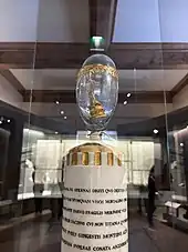These plans were dropped, however, after Pope Urban VIII and his nephew, Cardinal Francesco Barberini, protested,[162][163][164] because Galileo had been condemned by the Catholic Church for "vehement suspicion of heresy".[165] He was instead buried in a small room next to the novices' chapel at the end of a corridor from the southern transept of the basilica to the sacristy.[162][166] He was reburied in the main body of the basilica in 1737 after a monument had been erected there in his honour;[167][168] during this move, three fingers and a tooth were removed from his remains.[169] One of these fingers is currently on exhibition at the Museo Galileo in Florence, Italy.[170]