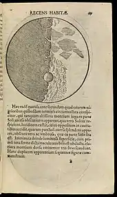 On 30 November 1609, Galileo aimed his telescope at the Moon.[45] While not being the first person to observe the Moon through a telescope (English mathematician Thomas Harriot had done it four months before but only saw a "strange spottednesse"),[46] Galileo was the first to deduce the cause of the uneven waning as light occlusion from lunar mountains and craters. In his study, he also made topographical charts, estimating the heights of the mountains. The Moon was not what was long thought to have been a translucent and perfect sphere, as Aristotle claimed, and hardly the first "planet", an "eternal pearl to magnificently ascend into the heavenly empyrian", as put forth by Dante. Galileo is sometimes credited with the discovery of the lunar libration in latitude in 1632,[47] although Thomas Harriot or William Gilbert might have done it before.[48]