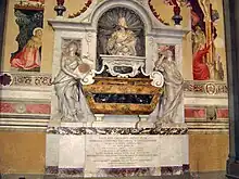 Galileo continued to receive visitors until his death on 8 January 1642, aged 77, following a fever and heart palpitations.[14][161] The Grand Duke of Tuscany, Ferdinando II, wished to bury him in the main body of the Basilica of Santa Croce, next to the tombs of his father and other ancestors, and to erect a marble mausoleum in his honour.[162][163]