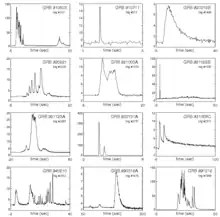 The light curves of gamma-ray bursts are extremely diverse and complex.[55] No two gamma-ray burst light curves are identical,[56] with large variation observed in almost every property: the duration of observable emission can vary from milliseconds to tens of minutes, there can be a single peak or several individual subpulses, and individual peaks can be symmetric or with fast brightening and very slow fading. Some bursts are preceded by a "precursor" event, a weak burst that is then followed (after seconds to minutes of no emission at all) by the much more intense "true" bursting episode.[57] The light curves of some events have extremely chaotic and complicated profiles with almost no discernible patterns.[34]