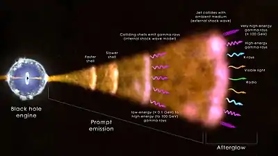 The nature of the longer-wavelength afterglow emission (ranging from X-ray through radio) that follows gamma-ray bursts is better understood. Any energy released by the explosion not radiated away in the burst itself takes the form of matter or energy moving outward at nearly the speed of light. As this matter collides with the surrounding interstellar gas, it creates a relativistic shock wave that then propagates forward into interstellar space. A second shock wave, the reverse shock, may propagate back into the ejected matter. Extremely energetic electrons within the shock wave are accelerated by strong local magnetic fields and radiate as synchrotron emission across most of the electromagnetic spectrum.[136][137] This model has generally been successful in modeling the behavior of many observed afterglows at late times (generally, hours to days after the explosion), although there are difficulties explaining all features of the afterglow very shortly after the gamma-ray burst has occurred.[138]