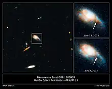 New developments since the 2000s include the recognition of short gamma-ray bursts as a separate class (likely from merging neutron stars and not associated with supernovae), the discovery of extended, erratic flaring activity at X-ray wavelengths lasting for many minutes after most GRBs, and the discovery of the most luminous (GRB 080319B) and the former most distant (GRB 090423) objects in the universe.[47][48] The most distant known GRB, GRB 090429B, is now the most distant known object in the universe.