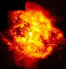 The intense radiation of most observed GRBs is thought to be released during a supernova or superluminous supernova as a high-mass star implodes to form a neutron star or a black hole. A subclass of GRBs appears to originate from the merger of binary neutron stars.[10]