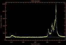 The precursor event occurs in a wide range of time frames before the main burst. This time can range up to hundreds of seconds.[1] The precursors typically, but not always, show a non-thermal spectrum. Notably, the first gamma-ray precursor to be detected showed a thermal spectrum, with a peak in the X-ray wavelengths.[5] There is no set definition of a precursor. Some allow a broad definition, where the precursor is merely a less-energetic event that happens before the main burst, while some impose additional restrictions, such as the precursor having a longer duration than the actual burst.[4] This is the main reason varying percentages of precursors in samples have been found.[4]