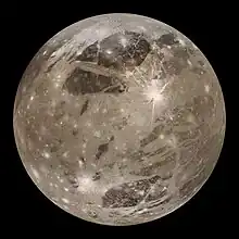 Ganymede is composed of silicate rock and water in approximately equal proportions. It is a fully differentiated body with an iron-rich, liquid core, and an internal ocean that potentially contains more water than all of Earth's oceans combined.[18][19][20][21] Its surface is composed of two main types of terrain.
