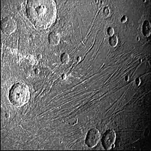 Cratering is seen on both types of terrain, but is especially extensive on the dark terrain: it appears to be saturated with impact craters and has evolved largely through impact events.[9] The brighter, grooved terrain contains many fewer impact features, which have been only of minor importance to its tectonic evolution.[9] The density of cratering indicates an age of 4 billion years for the dark terrain, similar to the highlands of the Moon, and a somewhat younger age for the grooved terrain (but how much younger is uncertain).[61] Ganymede may have experienced a period of heavy cratering 3.5 to 4 billion years ago similar to that of the Moon.[61] If true, the vast majority of impacts happened in that epoch, whereas the cratering rate has been much smaller since.[62] Craters both overlay and are crosscut by the groove systems, indicating that some of the grooves are quite ancient. Relatively young craters with rays of ejecta are also visible.[62][63] Ganymedian craters are flatter than those on the Moon and Mercury. This is probably due to the relatively weak nature of Ganymede's icy crust, which can (or could) flow and thereby soften the relief. Ancient craters whose relief has disappeared leave only a "ghost" of a crater known as a palimpsest.[62]