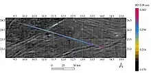 Ganymede's surface has an albedo of about 43 percent.[48] Water ice seems to be ubiquitous on its surface, with a mass fraction of 50–90 percent,[9] significantly more than in Ganymede as a whole. Near-infrared spectroscopy has revealed the presence of strong water ice absorption bands at wavelengths of 1.04, 1.25, 1.5, 2.0 and 3.0 μm.[48] The grooved terrain is brighter and has a more icy composition than the dark terrain.[49] The analysis of high-resolution, near-infrared and UV spectra obtained by the Galileo spacecraft and from Earth observations has revealed various non-water materials: carbon dioxide, sulfur dioxide and, possibly, cyanogen, hydrogen sulfate and various organic compounds.[9][50] Galileo results have also shown magnesium sulfate (MgSO4) and, possibly, sodium sulfate (Na2SO4) on Ganymede's surface.[38][51] These salts may originate from the subsurface ocean.[51]