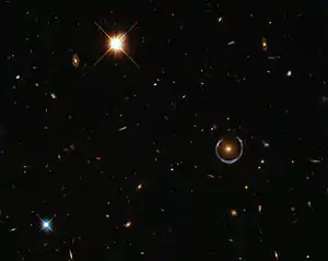 The deflection of light by gravity is responsible for a new class of astronomical phenomena. If a massive object is situated between the astronomer and a distant target object with appropriate mass and relative distances, the astronomer will see multiple distorted images of the target. Such effects are known as gravitational lensing.[110] Depending on the configuration, scale, and mass distribution, there can be two or more images, a bright ring known as an Einstein ring, or partial rings called arcs.[111] The earliest example was discovered in 1979;[112] since then, more than a hundred gravitational lenses have been observed.[113] Even if the multiple images are too close to each other to be resolved, the effect can still be measured, e.g., as an overall brightening of the target object; a number of such "microlensing events" have been observed.[114]