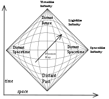 With Lorentz symmetry, additional structures come into play. They are defined by the set of light cones (see image). The light-cones define a causal structure: for each event A, there is a set of events that can, in principle, either influence or be influenced by A via signals or interactions that do not need to travel faster than light (such as event B in the image), and a set of events for which such an influence is impossible (such as event C in the image). These sets are observer-independent.[34] In conjunction with the world-lines of freely falling particles, the light-cones can be used to reconstruct the spacetime's semi-Riemannian metric, at least up to a positive scalar factor. In mathematical terms, this defines a conformal structure[35] or conformal geometry.