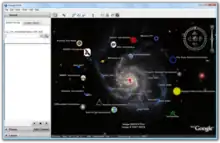 New features such as multi-wavelength data, positions of major satellites and their orbits as well as educational resources are provided to the Google Earth community and also through Christian and Conti's website for Sky.[41] Also visible on Sky mode are constellations, stars, galaxies, and animations depicting the planets in their orbits. A real-time Google Sky mashup of recent astronomical transients, using the VOEvent protocol, is provided by the VOEventNet collaboration.[42] Other programs similar to Google Sky include Microsoft WorldWide Telescope and Stellarium.