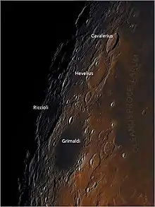 Grimaldi is a large basin located near the western limb of the Moon. It lies to the southwest of the Oceanus Procellarum, and southeast of the crater Riccioli. Between Oceanus Procellarum is Damoiseau, and to the north is Lohrmann.