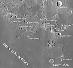 By convention these features are identified on lunar maps by placing the letter on the side of the crater midpoint that is closest to Gruithuisen.