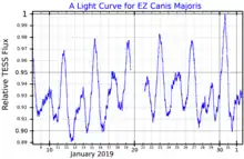EZ CMa has an apparent visual magnitude which varies between 6.71 and 6.95 over a period of 3.766 days, along with changes in the spectrum.[9] It has been proposed that it could be a binary star, with a neutron star as companion that would complete an orbit around the Wolf-Rayet with that period, being the cause of those variations. The General Catalogue of Variable Stars lists it as a possible cataclysmic variable on this basis. It has been argued that the companion does not exist and spectral variations are caused by activity on the star's surface.[9]