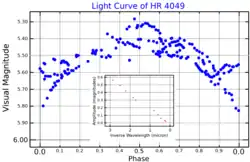 ![]() A light curve for HR 4049. The main plot shows the visual band brightness over one orbital period. The inset plot shows how the amplitude of the brightness change varies as a function of wavelength−1; as the observing wavelength increases, the opacity of the dust decreases, so the dust obscures less of the star's light. Adapted from Jorissen & Frankowski (2008)[1] | |