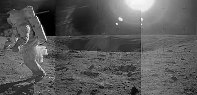 Apollo 12 astronauts Pete Conrad and Alan Bean landed the Lunar Module (LM) Intrepid northeast of Head crater on November 19, 1969. To the east of Head is the larger Surveyor crater. To the southwest are Bench crater and Sharp crater (now called Sharp-Apollo). To the northwest of Head is the larger crater Middle Crescent.