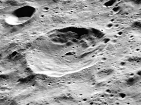 Henderson is a crater on the far side of the Moon. It is located to the east of the huge walled plain Mendeleev. This is a worn crater with a shallow rim. No significant craters overlie the rim or interior, but a smaller, worn crater is attached to the southern outer rim. A ridge of material runs from the northwest rim to the midpoint of the floor. Henderson lies within the eroded remains of a larger and older crater-like feature.