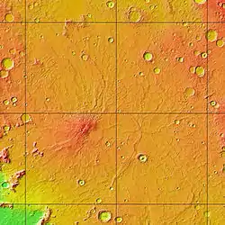 The Hesperian is a geologic system and time period on the planet Mars characterized by widespread volcanic activity and catastrophic flooding that carved immense outflow channels across the surface. The Hesperian is an intermediate and transitional period of Martian history. During the Hesperian, Mars changed from the wetter and perhaps warmer world of the Noachian to the dry, cold, and dusty planet seen today.[1] The absolute age of the Hesperian Period is uncertain. The beginning of the period followed the end of the Late Heavy Bombardment[2] and probably corresponds to the start of the lunar Late Imbrian period,[3][4] around 3700 million years ago (Mya). The end of the Hesperian Period is much more uncertain and could range anywhere from 3200 to 2000 Mya,[5] with 3000 Mya being frequently cited. The Hesperian Period is roughly coincident with the Earth's early Archean Eon.[2]