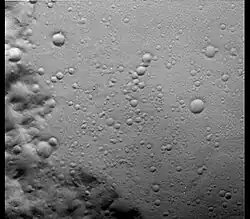 The lower boundary of the Hesperian System is defined as the base of the ridged plains, which are typified by Hesperia Planum and cover about a third of the planet's surface.[3] In eastern Hesperia Planum, the ridged plains overlie early to mid Noachian aged cratered plateau materials (pictured left).[15] The Hesperian's upper boundary is more complex and has been redefined several times based on increasingly detailed geologic mapping.[3][12][26] Currently, the stratigraphic boundary of the Hesperian with the younger Amazonian System is defined as the base of the Vastitas Borealis Formation[27] (pictured right). The Vastitas Borealis is a vast, low-lying plain that covers much of the northern hemisphere of Mars. It is generally interpreted to consist of reworked sediments originating from the Late Hesperian outflow channels and may be the remnant of an ocean that covered the northern lowland basins. Another interpretation of the Vastitas Borealis Formation is that it consists of lava flows.[28]