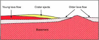 Martian time periods are based on geologic mapping of surface units from spacecraft images.[12][16] A surface unit is a terrain with a distinct texture, color, albedo, spectral property, or set of landforms that distinguish it from other surface units and is large enough to be shown on a map.[17] Mappers use a stratigraphic approach pioneered in the early 1960s for photogeologic studies of the Moon.[18] Although based on surface characteristics, a surface unit is not the surface itself or group of landforms. It is an inferred geologic unit (e.g., formation) representing a sheetlike, wedgelike, or tabular body of rock that underlies the surface.[19][20] A surface unit may be a crater ejecta deposit, lava flow, or any surface that can be represented in three dimensions as a discrete stratum bound above or below by adjacent units (illustrated right). Using principles such as superpositioning (illustrated left), cross-cutting relationships, and the relationship of impact crater density to age, geologists can place the units into a relative age sequence from oldest to youngest. Units of similar age are grouped globally into larger, time-stratigraphic (chronostratigraphic) units, called systems. For Mars, four systems are defined: the Pre-Noachian, Noachian, Hesperian, and Amazonian. Geologic units lying below (older than) the Noachian are informally designated Pre-Noachian.[21] The geologic time (geochronologic) equivalent of the Hesperian System is the Hesperian Period. Rock or surface units of the Hesperian System were formed or deposited during the Hesperian Period.