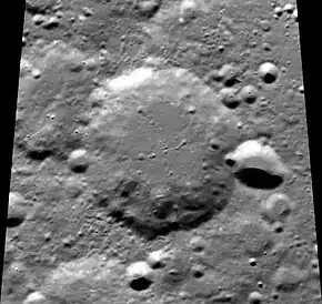 This is a relatively old formation that has become worn and eroded due to subsequent impacts. The general outline of the outer rim is still visible, but it is overlaid along the eastern edge by a smaller crater. There is also a small craterlet along the western edge. The inner wall is marked by a number of tiny craterlets, and is slightly wider at the southern edge with a ridge-like projection. The interior floor is level and almost featureless, with only a few tiny craterlets to mark the surface.