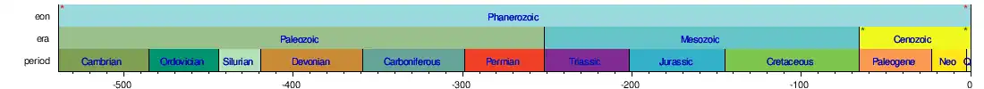 The Phanerozoic is the current eon on Earth, which started approximately 538.8 million years ago. It consists of three eras: The Paleozoic, Mesozoic, and Cenozoic,[105] and is the time when multi-cellular life greatly diversified into almost all the organisms known today.[147]