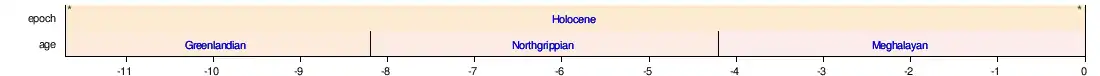 The history of the Earth can be organized chronologically according to the geologic time scale, which is split into intervals based on stratigraphic analysis.[2][23] The following five timelines show the geologic time scale to scale. The first shows the entire time from the formation of the Earth to the present, but this gives little space for the most recent eon. The second timeline shows an expanded view of the most recent eon. In a similar way, the most recent era is expanded in the third timeline, the most recent period is expanded in the fourth timeline, and the most recent epoch is expanded in the fifth timeline.