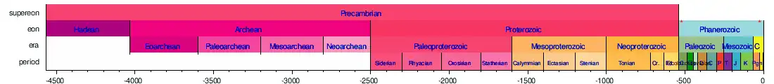 −4500 — – — – −4000 — – — – −3500 — – — – −3000 — – — – −2500 — – — – −2000 — – — – −1500 — – — – −1000 — – — – −500 — – — – 0 — | Water Single-celled life Photosynthesis Eukaryotes Multicellular life P l a n t s Arthropods Molluscs Flowers Dinosaurs Mammals Birds Primates H a d e a n A r c h e a n P r o t e r o z o i c P h a n e r o z o i c |