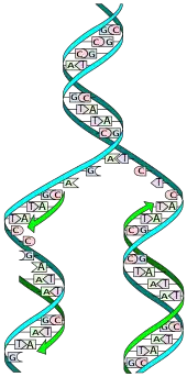 The discovery that a kind of RNA molecule called a ribozyme can catalyze both its own replication and the construction of proteins led to the hypothesis that earlier life-forms were based entirely on RNA.[79] They could have formed an RNA world in which there were individuals but no species, as mutations and horizontal gene transfers would have meant that the offspring in each generation were quite likely to have different genomes from those that their parents started with.[80] RNA would later have been replaced by DNA, which is more stable and therefore can build longer genomes, expanding the range of capabilities a single organism can have.[81] Ribozymes remain as the main components of ribosomes, the "protein factories" of modern cells.[82]