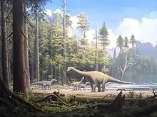 The Mesozoic ("middle life") era lasted from 251.9 Ma to 66 Ma.[105] It is subdivided into the Triassic, Jurassic, and Cretaceous periods. The era began with the Permian–Triassic extinction event, the most severe extinction event in the fossil record; 95% of the species on Earth died out.[149] It ended with the Cretaceous–Paleogene extinction event that wiped out the dinosaurs.[150]