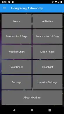 The Apps provided daily astronomy and space-related news, observational information, astronomical activities, regional night sky conditions, 16-day weather forecast, cloud coverage forecast, moon phase, sunrise, sunset, moonrise, moonset, and other relevant information.