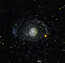 An intermediate spiral galaxy is a galaxy that is in between the classifications of a barred spiral galaxy and an unbarred spiral galaxy. It is designated as SAB in the galaxy morphological classification system devised by Gerard de Vaucouleurs.[1] Subtypes are labeled as SAB0, SABa, SABb, or SABc, following a sequence analogous to the Hubble sequence for barred and unbarred spirals. The subtype (0, a, b, or c) is based on the relative prominence of the central bulge and how tightly wound the spiral arms are.