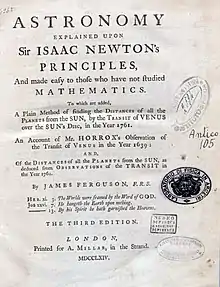 James Ferguson (25 April 1710 – 17 November 1776) was a Scottish astronomer.[1] He is known as the inventor and improver of astronomical and other scientific apparatus, as a striking instance of self education and as an itinerant lecturer.