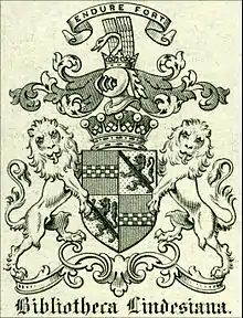 The bulk of the library was kept at Haigh Hall[16] in Lancashire with a part at Balcarres. The Earl issued an extensive catalogue of the library in 1910: Catalogue of the Printed Books Preserved at Haigh Hall, Wigan, 4 vols. folio, Aberdeen University Press, printers. Companion volumes to the catalogue record the royal proclamations and philatelic literature. The cataloguing and organisation of the library was a major task for a team of librarians led by J. P. Edmond.[17][18] Two catalogues were issued privately in 1895 and 1898, of the Chinese books and manuscripts (by J. P. Edmond) and of the Oriental manuscripts, Arabic, Persian, Turkish (by Michael Kerney).[19] The manuscript collections (including Chinese and Japanese printed books) were sold in 1901 to Enriqueta Augustina Rylands for the John Rylands Library. Other parts of the collections have since been donated to or deposited in national or university libraries, including the National Library of Scotland. In 1946 the deposited collections were distributed to the British Museum, Cambridge University Library, and the John Rylands Library.[20] Changes to these locations were made by later Earls of Crawford; apart from the Crawford family muniments those at the John Rylands Library were removed in 1988.