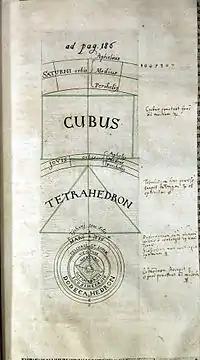 Kepler thought the Mysterium had revealed God's geometrical plan for the universe. Much of Kepler's enthusiasm for the Copernican system stemmed from his theological convictions about the connection between the physical and the spiritual; the universe itself was an image of God, with the Sun corresponding to the Father, the stellar sphere to the Son, and the intervening space between them to the Holy Spirit. His first manuscript of Mysterium contained an extensive chapter reconciling heliocentrism with biblical passages that seemed to support geocentrism.[60] With the support of his mentor Michael Maestlin, Kepler received permission from the Tübingen university senate to publish his manuscript, pending removal of the Bible exegesis and the addition of a simpler, more understandable, description of the Copernican system as well as Kepler's new ideas. Mysterium was published late in 1596, and Kepler received his copies and began sending them to prominent astronomers and patrons early in 1597; it was not widely read, but it established Kepler's reputation as a highly skilled astronomer. The effusive dedication, to powerful patrons as well as to the men who controlled his position in Graz, also provided a crucial doorway into the patronage system.[61]