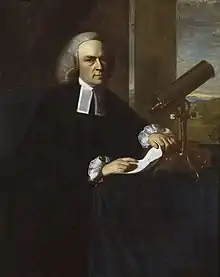Professor Winthrop was one of the foremost men of science in America during the 18th century, and his impact on its early advance in New England was particularly significant. Both Benjamin Franklin and Benjamin Thompson (Count Rumford) probably owed much of their early interest in scientific research to his influence. He also had a decisive influence in the early philosophical education of John Adams during the latter's time at Harvard. He corresponded regularly with the Royal Society in London—as such, he was one of the first American intellectuals to be taken seriously in Europe. He was elected to the revived American Philosophical Society in 1768.[1] He was noted for attempting to explain the great Lisbon earthquake of 1755 as a scientific—rather than religious—phenomenon, and his application of mathematical computations to earthquake activity following the great quake formed the basis of the claim made on his behalf as the founder of the science of seismology. Additionally, he observed the transits of Mercury in 1740 and 1761 and journeyed to Newfoundland to observe a transit of Venus.[2] He traveled in a ship provided by the Province of Massachusetts—probably the first scientific expedition ever sent out by any incipient American state. Winthrop was recorded as owning two enslaved men, George and Scipio, in 1759 and 1761 respectively.[3]