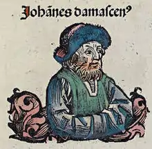 The tribal background of Mansur ibn Sarjun, John's grandfather, is unknown, but biographer Daniel Sahas has speculated that the name Mansur could have implied descent from the Arab Christian tribes of Kalb or Taghlib.[18] The name was common among Syrian Christians of Arab origins, and Eutychius noted that the governor of Damascus, who was likely Mansur ibn Sarjun, was an Arab.[18] However, Sahas also asserts that the name does not necessarily imply an Arab background and could have been used by non-Arab, Semitic Syrians.[18] While Sahas and biographers F. H. Chase and Andrew Louth assert that Mansūr was an Arabic name, Raymond le Coz asserts that the "family was without doubt of Syrian origin";[19] indeed, according to historian Daniel J. Janosik, "Both aspects could be true, for if his family ancestry were indeed Syrian, his grandfather [Mansur] could have been given an Arabic name when the Arabs took over the government."[20] When Syria was conquered by the Muslim Arabs in the 630s, the court at Damascus retained its large complement of Christian civil servants, John's grandfather among them.[15][17] John's father, Sarjun (Sergius), went on to serve the Umayyad caliphs.[15] John of Jerusalem claims that he also served as a senior official in the fiscal administration of the Umayyad Caliphate under Abd al-Malik before leaving Damascus and his position around 705 to go to Jerusalem and become a monk. However, this point is debated within the academic community as there is no trace of him in the Umayyad archives, unlike his father and grandfather. Some researchers, such as Robert G. Hoyland,[21] deny such an affiliation, while others, like Daniel Sahas or the Orthodox historian Jean Meyendorff, suppose that he might have been a lower-level tax administrator, a local tax collector who would not have needed to be mentioned in the archives, but who might not have necessarily been part of the court either.[22][23] In addition, John's own writings never refer to any experience in a Muslim court. It is believed that John became a monk at Mar Saba, and that he was ordained as a priest in 735.[15][24]