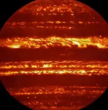 The spectrometer mapper JIRAM, operating in the near infrared (between 2 and 5 μm), conducts surveys in the upper layers of the atmosphere to a depth of between 50 and 70 km (31 and 43 mi) where the pressure reaches 5 to 7 bar (500 to 700 kPa). JIRAM will provide images of the aurora in the wavelength of 3.4 μm in regions with abundant H3+ ions. By measuring the heat radiated by the atmosphere of Jupiter, JIRAM can determine how clouds with water are flowing beneath the surface. It can also detect methane, water vapor, ammonia and phosphine. It was not required that this device meets the radiation resistance requirements.[81][82][83] The JIRAM instrument is expected to operate through the eighth orbit of Jupiter.[80]