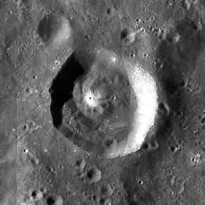 This crater has a well-defined and somewhat uneven rim that is roughly circular in shape. The inner walls have a higher albedo than the surrounding surface, giving them a lighter appearance. Parts of the inner wall have slumped across the inner floor, producing an irregular surface. At the midpoint of the interior is a low central rise, with a craterlet at the summit, giving the appearance of terrestrial volcano, although the peak is probably not volcanic.