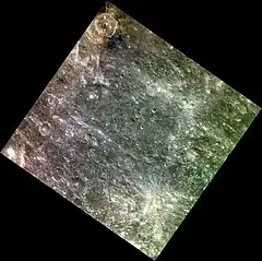 Regional approximate color view by MESSENGER, with Kenkō near center (indistinct)