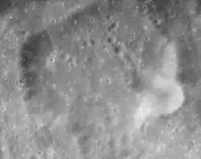 Only the western part of this crater's rim survives nearly intact, the remainder forming a faint outline on the surface. There is a small crater lying across eastern rim. The interior floor is unremarkable, with no features of interest.