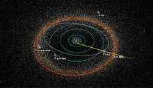 The Kuiper belt (/ˈkpər/ KY-pər)[1] is a circumstellar disc in the outer Solar System, extending from the orbit of Neptune at 30 astronomical units (AU) to approximately 50 AU from the Sun.[2] It is similar to the asteroid belt, but is far larger—20 times as wide and 20–200 times as massive.[3][4] Like the asteroid belt, it consists mainly of small bodies or remnants from when the Solar System formed. While many asteroids are composed primarily of rock and metal, most Kuiper belt objects are composed largely of frozen volatiles (termed "ices"), such as methane, ammonia, and water. The Kuiper belt is home to most of the objects that astronomers generally accept as dwarf planets: Orcus, Pluto,[5] Haumea,[6] Quaoar, and Makemake.[7] Some of the Solar System's moons, such as Neptune's Triton and Saturn's Phoebe, may have originated in the region.[8][9]