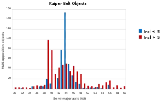 Histogram of the semi-major axes of Kuiper belt objects with inclinations above and below 5 degrees. Spikes from the plutinos and the 'kernel' are visible at 39–40 AU and 44 AU.