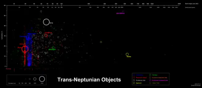 Distribution of cubewanos (blue), Resonant trans-Neptunian objects (red), Sednoids (yellow) and scattered objects (grey)