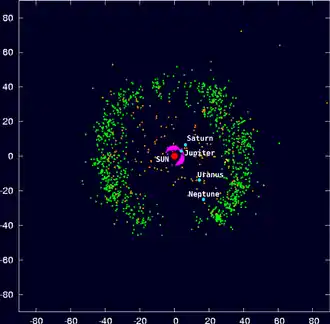 The Kuiper belt (green), in the Solar System's outskirts