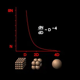 The size distributions of the Kuiper belt objects follow a number of power laws. A power law describes the relationship between N(D) (the number of objects of diameter greater than D) and D, and is referred to as brightness slope. The number of objects is inversely proportional to some power of the diameter D: