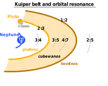 When an object's orbital period is an exact ratio of Neptune's (a situation called a mean-motion resonance), then it can become locked in a synchronised motion with Neptune and avoid being perturbed away if their relative alignments are appropriate. If, for instance, an object orbits the Sun twice for every three Neptune orbits, and if it reaches perihelion with Neptune a quarter of an orbit away from it, then whenever it returns to perihelion, Neptune will always be in about the same relative position as it began, because it will have completed 1+12 orbits in the same time. This is known as the 2:3 (or 3:2) resonance, and it corresponds to a characteristic semi-major axis of about 39.4 AU. This 2:3 resonance is populated by about 200 known objects,[61] including Pluto together with its moons. In recognition of this, the members of this family are known as plutinos. Many plutinos, including Pluto, have orbits that cross that of Neptune, although their resonance means they can never collide. Plutinos have high orbital eccentricities, suggesting that they are not native to their current positions but were instead thrown haphazardly into their orbits by the migrating Neptune.[62] IAU guidelines dictate that all plutinos must, like Pluto, be named for underworld deities.[52] The 1:2 resonance (whose objects complete half an orbit for each of Neptune's) corresponds to semi-major axes of ~47.7 AU, and is sparsely populated.[63] Its residents are sometimes referred to as twotinos. Other resonances also exist at 3:4, 3:5, 4:7, and 2:5.[26]:104 Neptune has a number of trojan objects, which occupy its Lagrangian points, gravitationally stable regions leading and trailing it in its orbit. Neptune trojans are in a 1:1 mean-motion resonance with Neptune and often have very stable orbits.