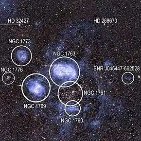 Outside the main "bubble" of N11 to the northeast is N11E, also known as NGC 1773, a small bright nebula containing several massive young stars. The south portion of the bubble is N11F, also called NGC 1760. The western portion of the bubble is faint and poorly-defined.[6]